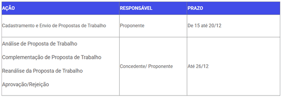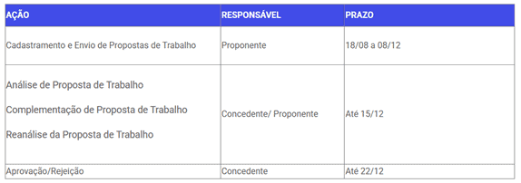 A primeira tabela é referente ao ciclo principal, no qual o cadastro e envio das propostas de trabalho já estão abertos desde 18 de agosto e encerram dia 8 de dezembro . A fase de análise, complementação e reanálise das propostas vai até dia 15 de dezembro.